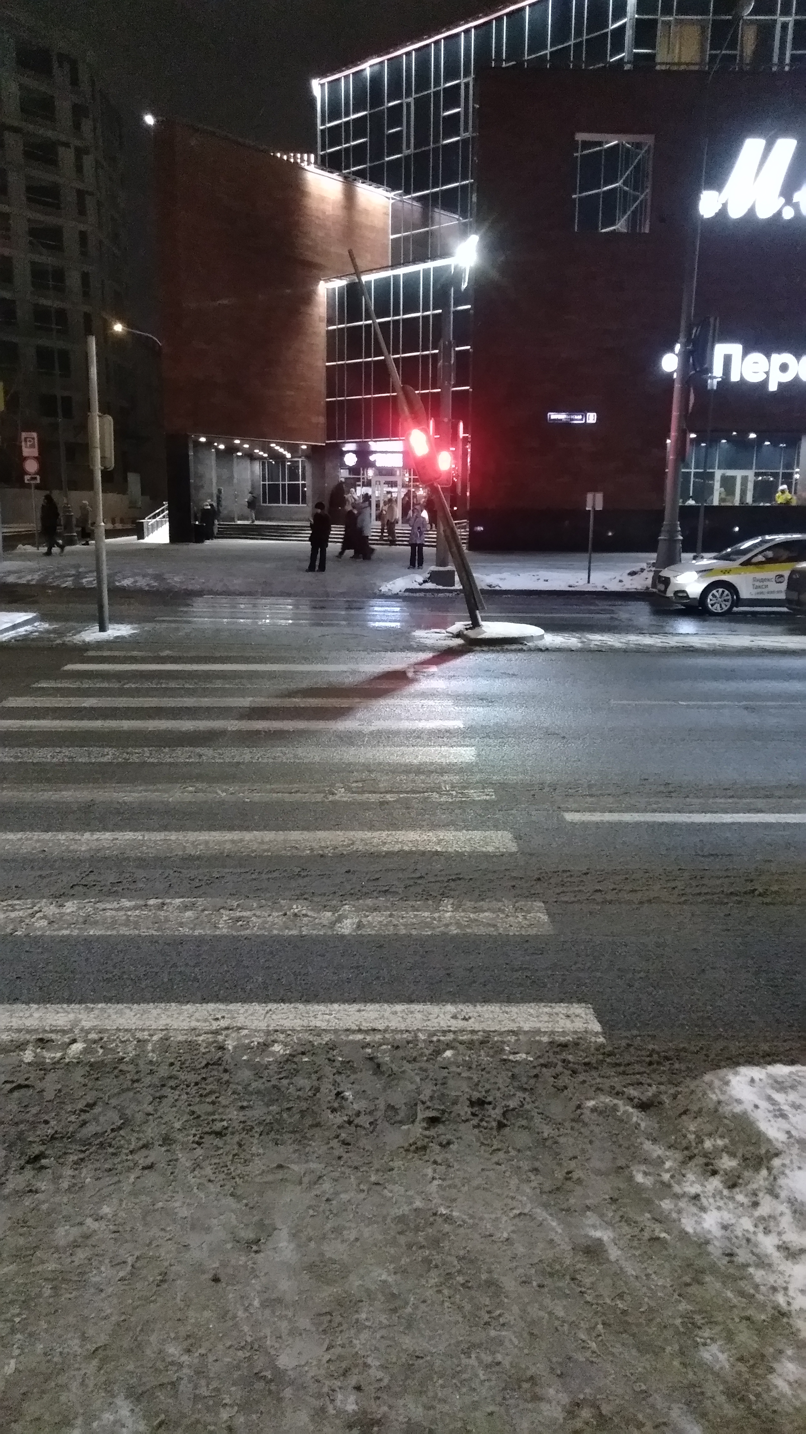 С работы домой я сегодня пошла другой дорогой и увидела покосившийся светофор. Видать, кто-то с разгона въехал. Надеюсь, остался жив.
